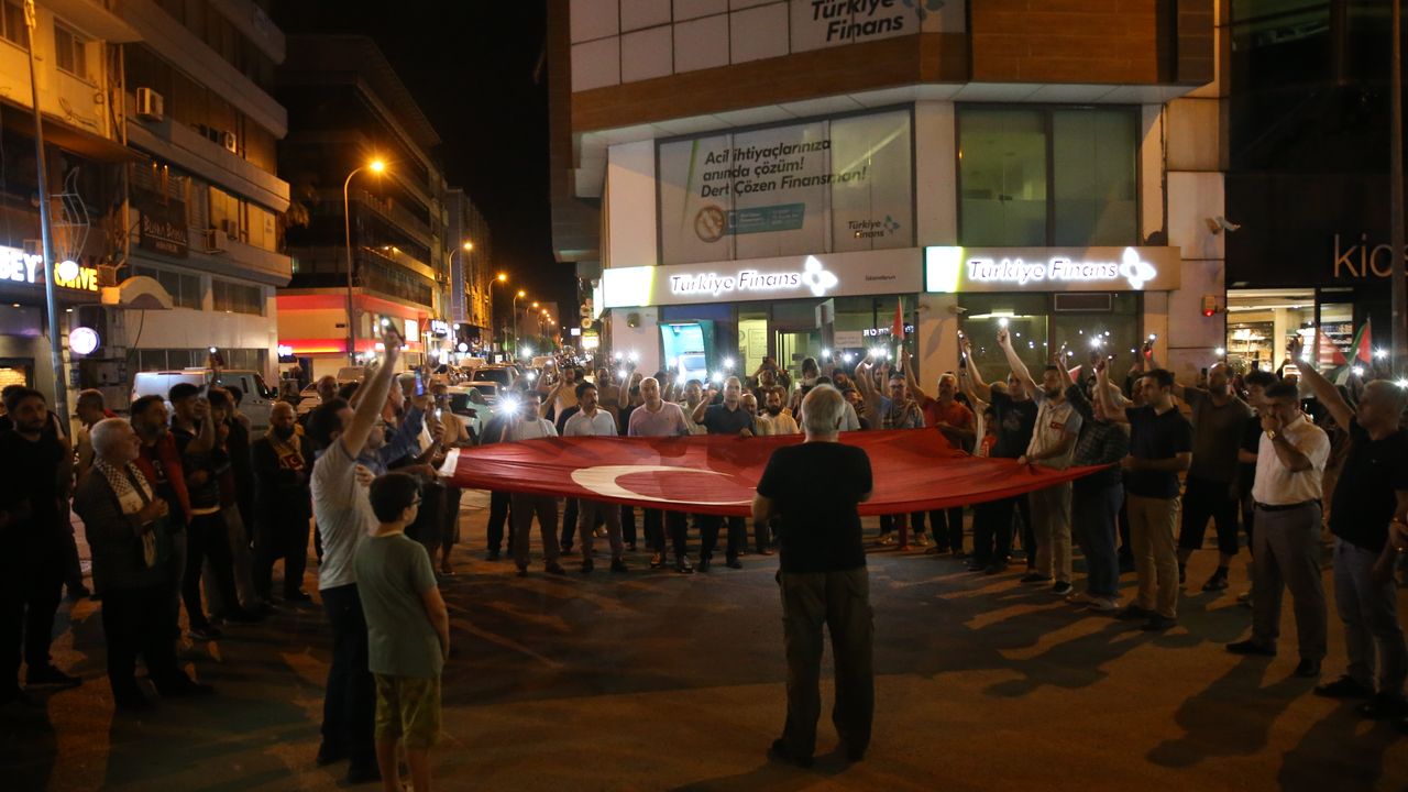 İskenderun ilçesi Savaş Mahallesi'nde toplanan grup, Türk ve Filistin bayrakları taşıdı, İsrail'e tepki gösterdi.
