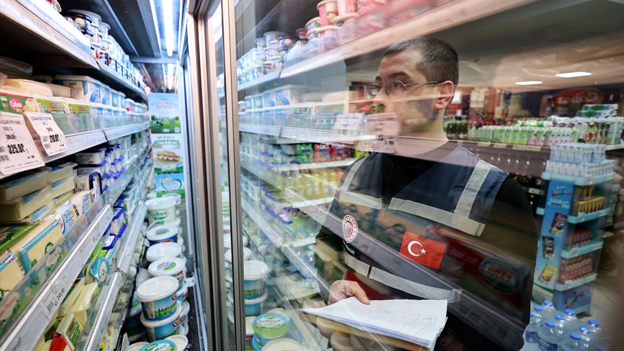 Bir alışveriş merkezindeki zincir market şubesini inceleyen ekip, satışa sunulan ürünlerin son kullanma tarihini, etiketini, kasa ve raflardaki fiyat uyumunu kontrol etti.