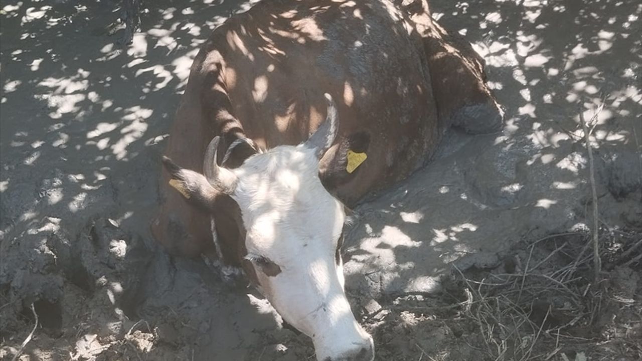 İlçede otlamaya çıkarılan ineklerden biri çamura saplandı.