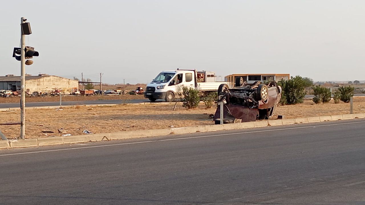 Çarpmanın etkisiyle savrulan araçlardan biri refüje devrildi.
