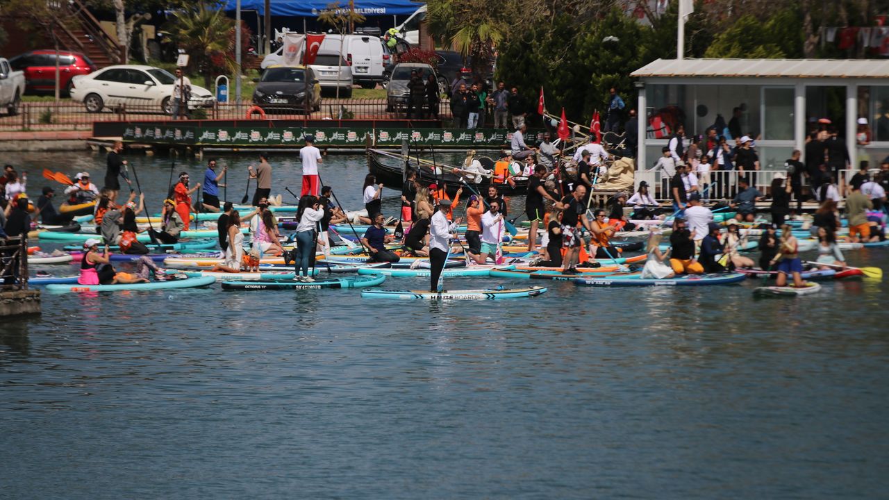 Renkli dumanlarla görsel şölen oluşturulan nehirde, kano, paddle board ve kürek takımları ile Büyükşehir Belediyesinin gondolları kortej geçişi yaptı.