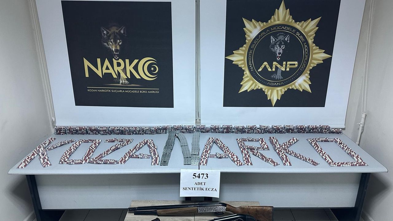Adreste ve şüphelinin üst aramasında 5 bin 473 uyuşturucu etkili hap, pompalı tüfek, av tüfeği ve kurusıkı tabanca ele geçirildi.