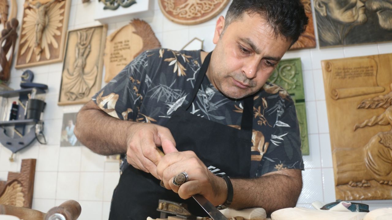 Tektaş, her sabah yolunu tuttuğu Toros Mahallesi'ndeki atölyesinde ıhlamur, kayın, ceviz, meşe ve sedir ağaçlarının parçalarını oyma aletleriyle işleyip şekil veriyor.