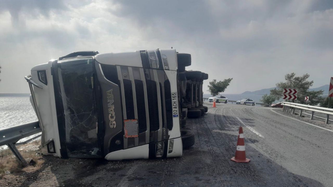 İ.D'nin kullandığı 02 ACH 165 plakalı tır, Bozdoğan Mahallesi Pullu mevkisinde devrildi.