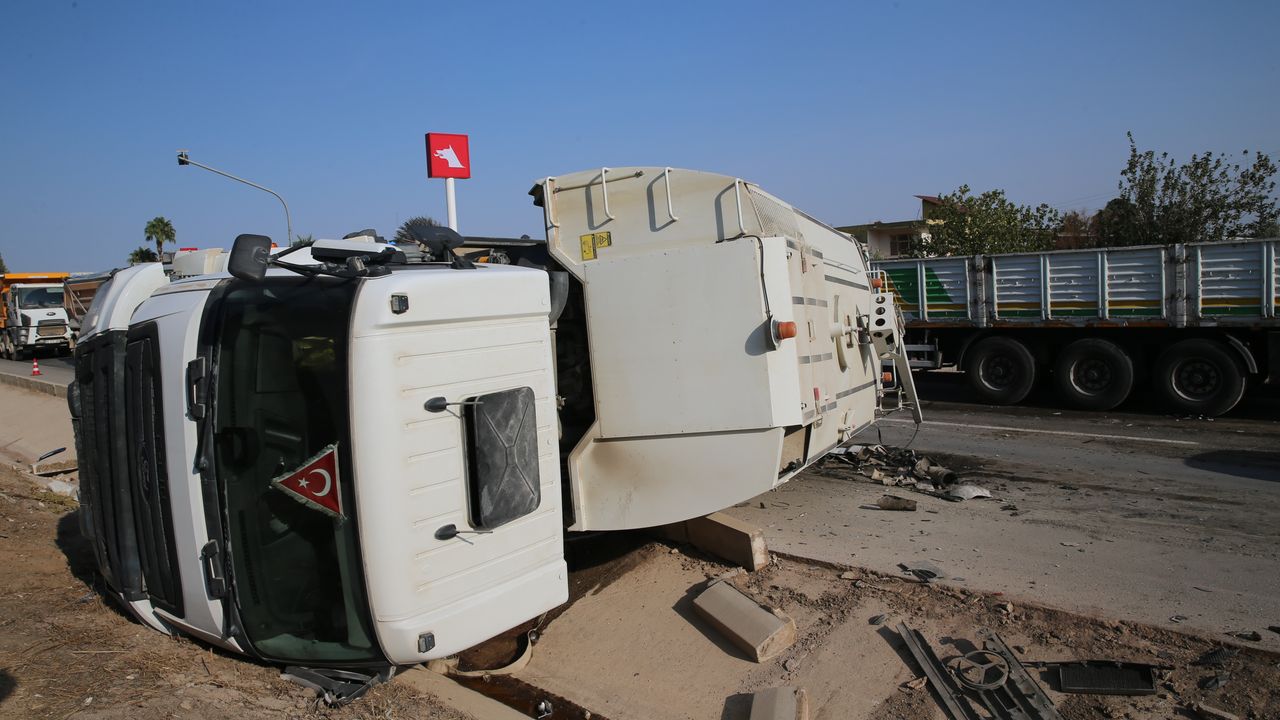HATAY (AA) - Hatay'ın merkez Antakya ilçesinde tırla çarpışan yol temizleme aracı devrildi.