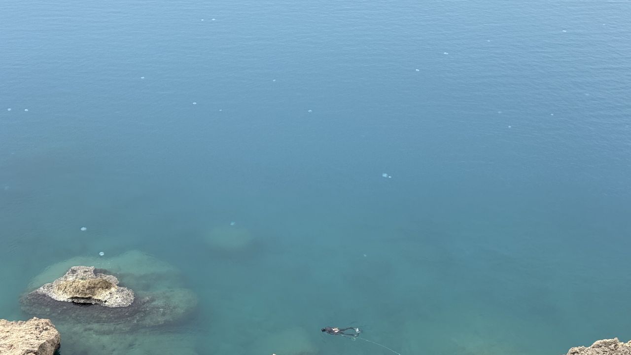 Anadolu Ajansı (AA) ekibi de Antalya Körfezi'ndeki denizanası yoğunluğunu dronla görüntüledi.