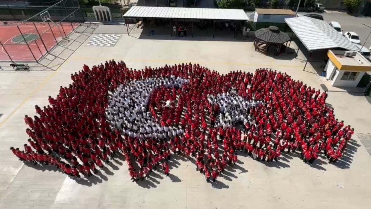 Okul bahçesinde 1300 öğrencinin katılımıyla Türkiye haritası koreografisi oluşturulması dronla görüntülendi. Öğrenciler marşlar söyleyip kutlama coşkusu yaşadı.