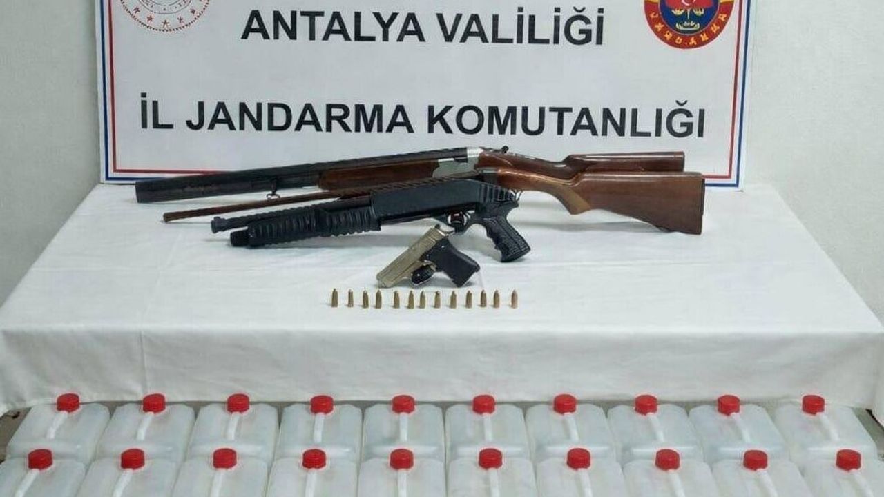 ANTALYA (AA) - Antalya'nın Döşemealtı ilçesinde jandarma ekiplerince yapılan operasyonda 160 litre kaçak alkol, bir tabanca ve iki av tüfeği ele geçirildi.