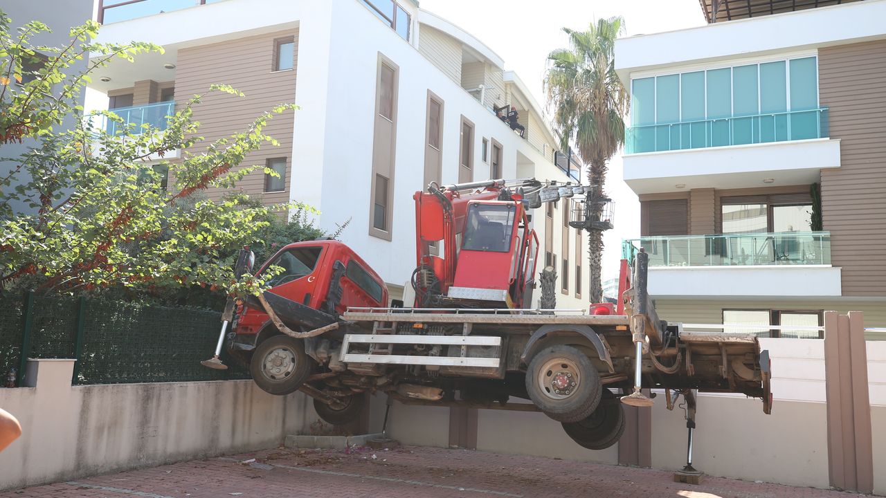 Bu sırada ayaklarından birinin hidrolik sistemi boşalan vinç, yan yattı. Vincin devrilmesini site duvarı engellerken, sepet ise palmiye ağacına takılı kaldı.