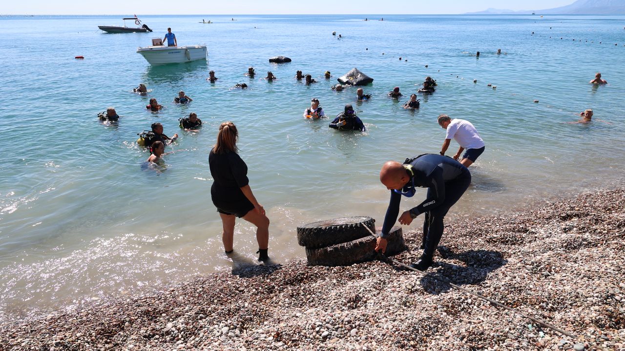 Konyaaltı Varyant Ekdağ 1 No'lu Plajı önünde dalgıçlar su altından plastik, cam ve pet şişeler ile metal parçalar çıkardı. Bu sırada gönüllüler de kıyıdaki çöpleri topladı.
