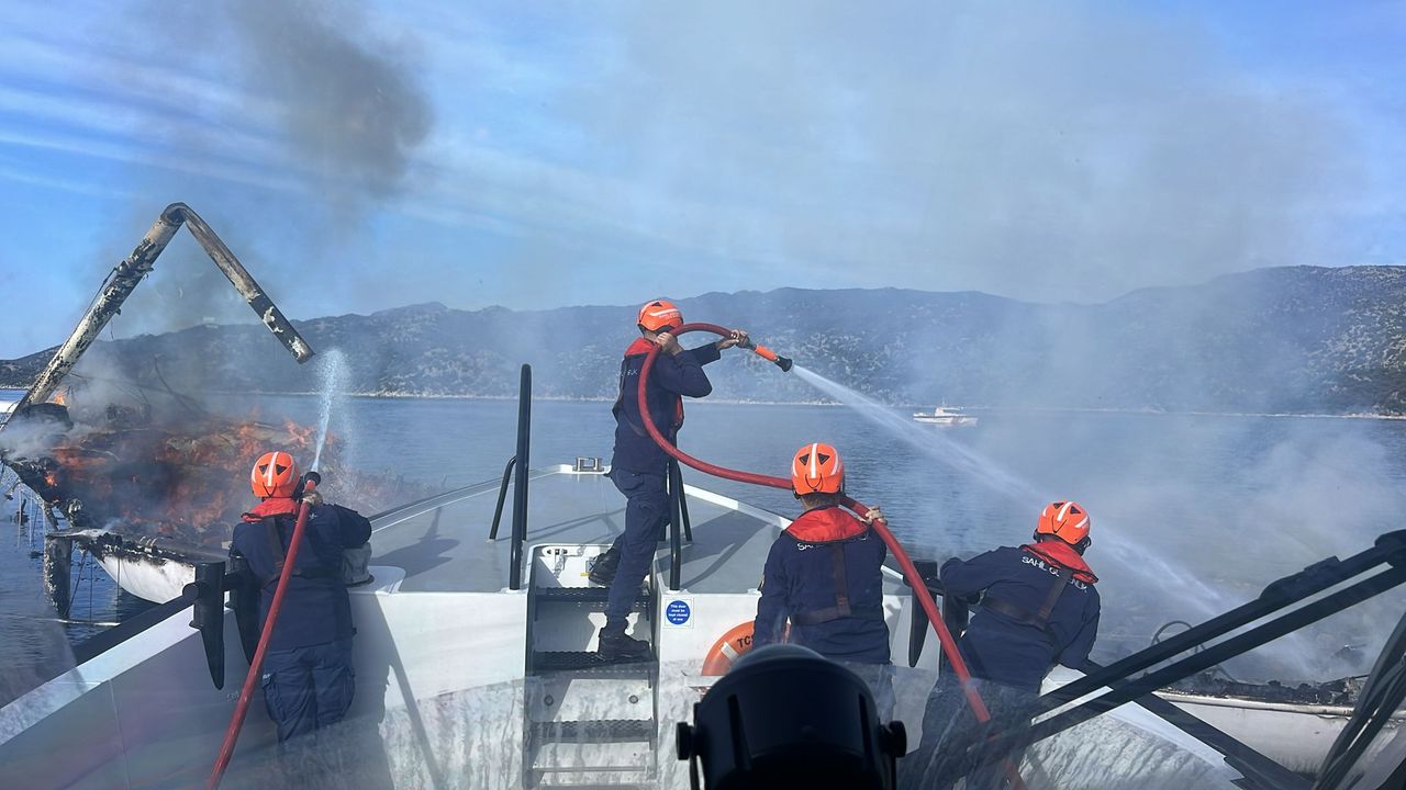 Çevredekilerin ihbarıyla bölgeye ulaşan Sahil Güvenlik ekipleri yanan gulete müdahale etti.