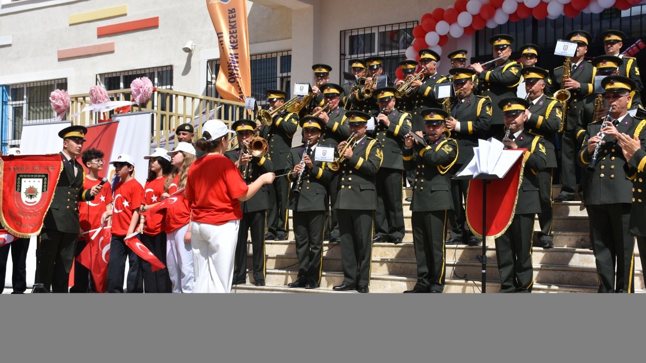 Etkinlikte öğrenciler tarafından hazırlanan dans, halk oyunu ve koro gösterilerinin ardından sahneye çıkan askeri bando takımı, seslendirdiği marşlar ve çocuk şarkılarıyla bayram coşkusunu artırdı.