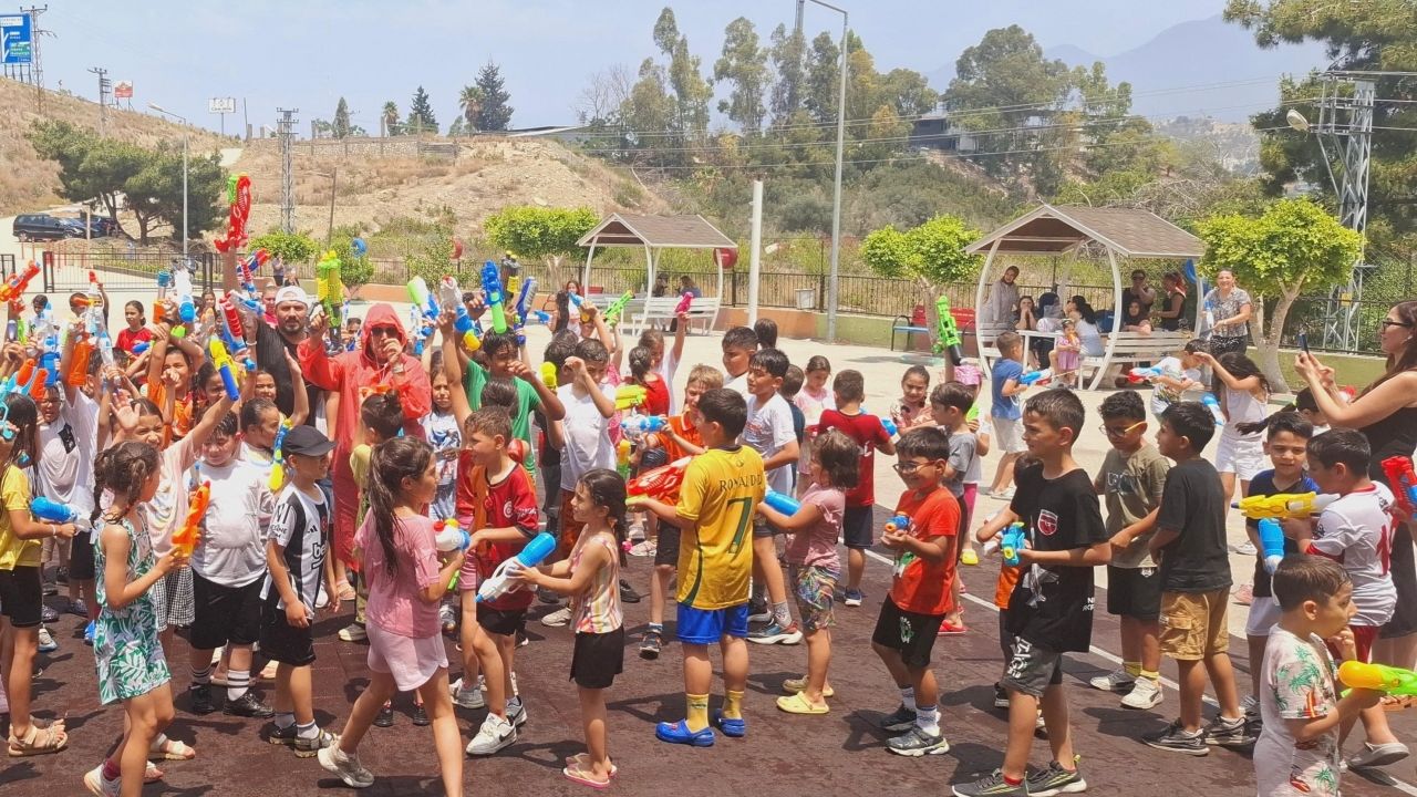 Gazi Abdurrahman Paşa İlkokulu'nun bahçesinde gerçekleştirilen etkinlikte öğrenciler ellerindeki su tabancaları ve su balonlarıyla birbirlerine su attı.