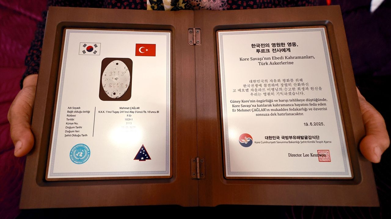Şehit Piyade Er Çağlar'ın künyesi, Koreli yetkililer tarafından 74 yıl sonra şehidin ablasının kızı olan Emine Çetin'e verildi.