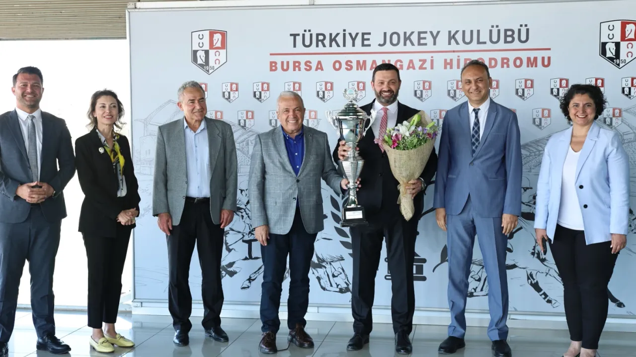 Nilüfer Belediye Başkanı Şadi Özdemir, koşunun ardından kazanan safkanın sahibi adına antrenör Eroğlu’na kupasını ve çiçeğini takdim etti.