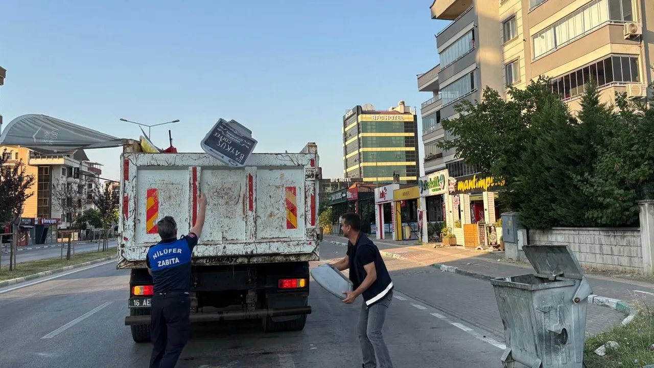 Bursa Nilüfer Belediyesi Zabıta ekipleri, 29 Ekim, Ataevler, 23 Nisan ve Altınşehir Mahallelerindeki cadde ve kaldırımlarda halk sağlığını tehdit eden ve kent estetiğini bozan duba ve tabelaları topladı.BURSA (İGFA) - Bursa Nilüfer Belediyesi Zabıta ekipleri, kent estetiğini bozan, halk sağlığını tehdit eden ve çevre kirliliği oluşturan unsurlara karşı mücadelesini sürdürüyor.