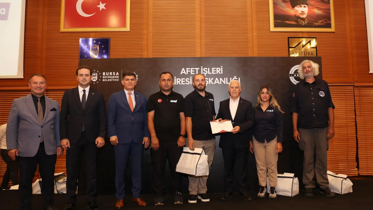 Bursa Büyükşehir Belediye Başkanı Mustafa Bozbey, geçtiğimiz haftalarda yaşanan orman yangınlarının söndürülmesinde gece gündüz çalışan itfaiye, AFAD, sivil toplum kuruluşları, dernekler, firmalar, moto kuryeler ve vatandaşlara teşekkür belgesi takdim etti. Bozbey, gönüllü itfaiyeciliğin geliştirilmesi gerektiğini vurguladı.BURSA (İGFA) - Bursa Büyükşehir Belediyesi, kentte yaşanan orman yangınlarına karşı fedakârca mücadele edenlere teşekkür etmek amacıyla Merinos Atatürk Kültür Merkezi’nde bir tören düzenledi. Törende, Büyükşehir Belediyesi İtfaiye Dairesi, AFAD, kamu kurumları, sivil toplum kuruluşları, firmalar, dernekler, moto kuryeler ve vatandaşlara teşekkür belgeleri verildi.