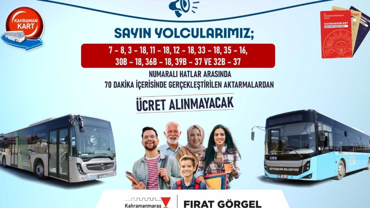 Şehir içi ulaşımda kalite ve erişilebilirliği artırmaya yönelik çalışmalarını kararlılıkla sürdüren Kahramanmaraş Büyükşehir Belediyesi, toplu taşıma kullanıcılarını yakından ilgilendiren yeni bir uygulamayı daha hayata geçirdi. Vatandaşların daha konforlu, ekonomik ve kesintisiz bir yolculuk yapabilmesini amaçlayan düzenleme kapsamında, belirli otobüs hatları arasında yapılacak aktarmalar ücretsiz olacak.
