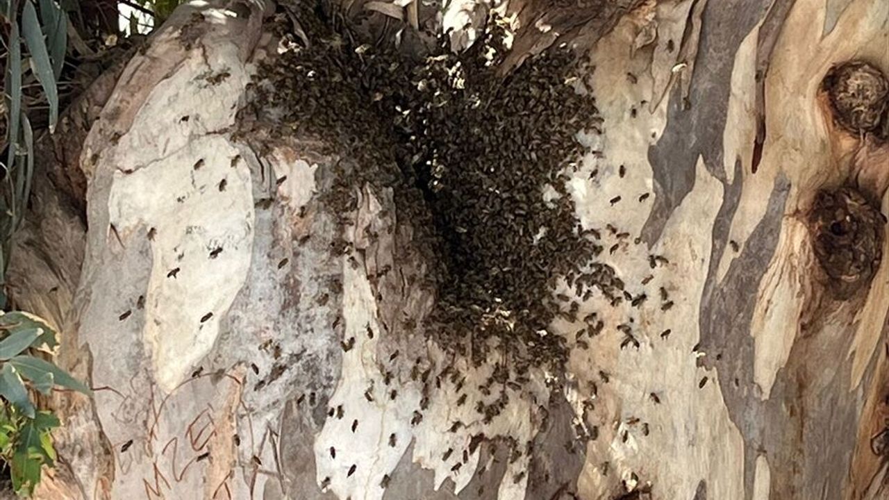 Kentte oğul veren bir kovandan kaçtığı tahmin edilen arı kolonisi, İskele Mahallesi'ndeki kumluk plajında bir süre gezdikten sonra bir ağaca kondu.