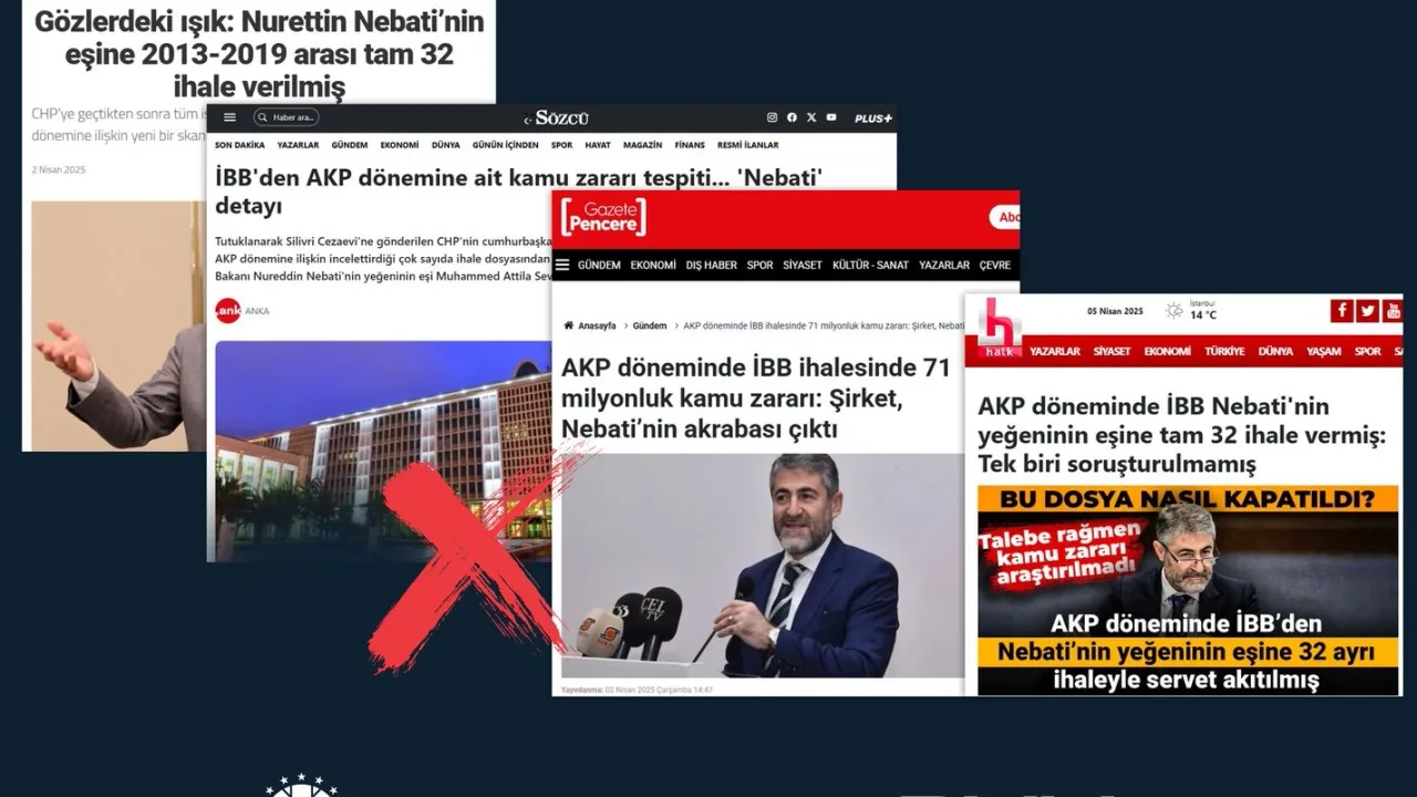 Bazı basın yayın organlarında yer alan, “Eski Bakan Nureddin Nebati’nin eşine İBB’den 32 ihale verilmiş” ve “AK Parti döneminde Nebati'nin yeğeninin eşine 32 ihale verilmiş” iddiaları doğru olmadığı açıklandı.ANKARA (İGFA) - Hazine ve Maliye eski Bakanı Nebati ile ilişkilendirilen ihale iddialarına yönelik açıklama İletişim Başkanlığı'ndan geldi.