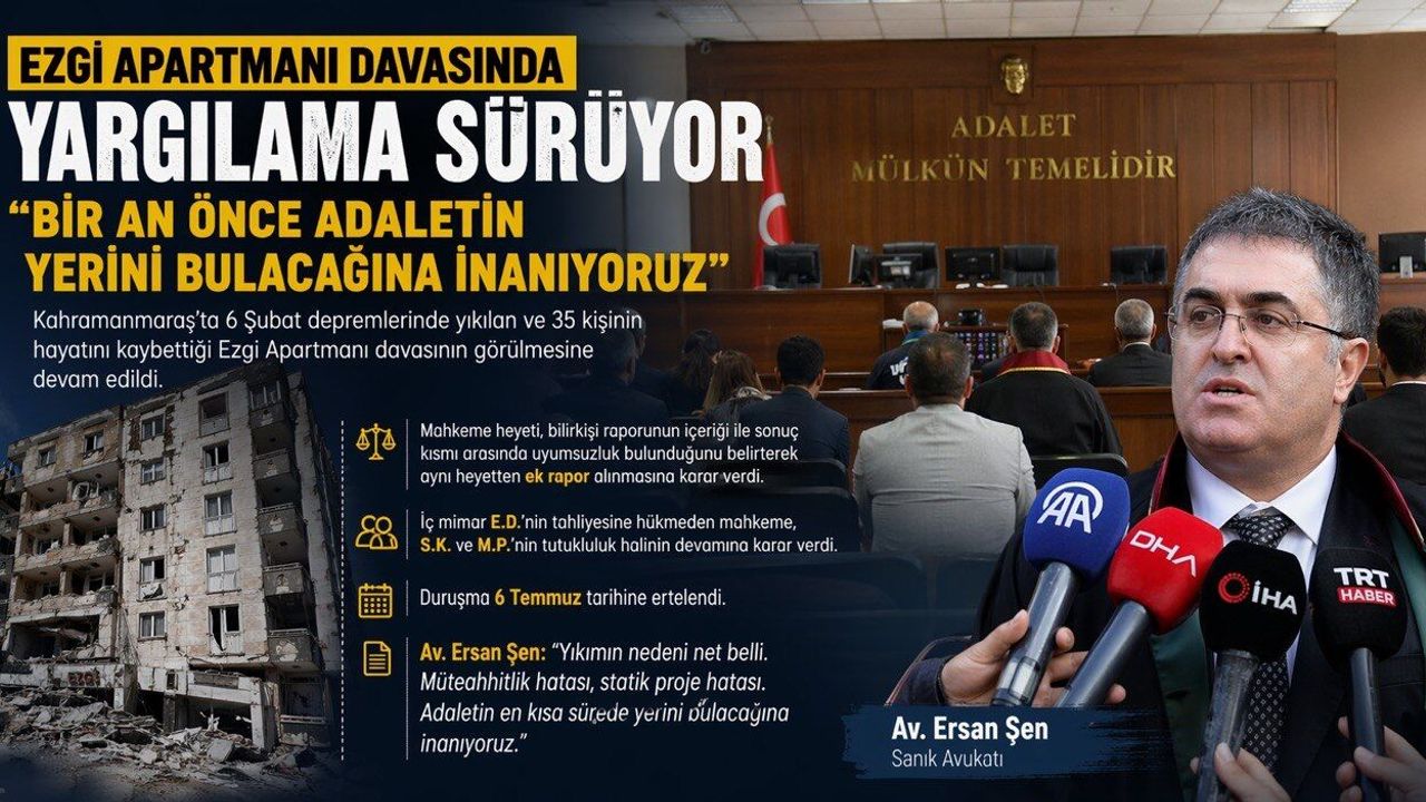 Şen, “Mahkeme, tadilatların binanın yıkımına etkisinin net şekilde ortaya konulması için ek rapor talep etti. Daha önce alınan teknik raporlar, yıkımın müteahhitlik ve statik proje hatasından kaynaklandığını açıkça gösteriyor. Hassas bir süreçten geçiyoruz. Sosyal medya baskısını anlıyoruz ancak adaletin en kısa sürede yerini bulacağına inanıyoruz” dedi.