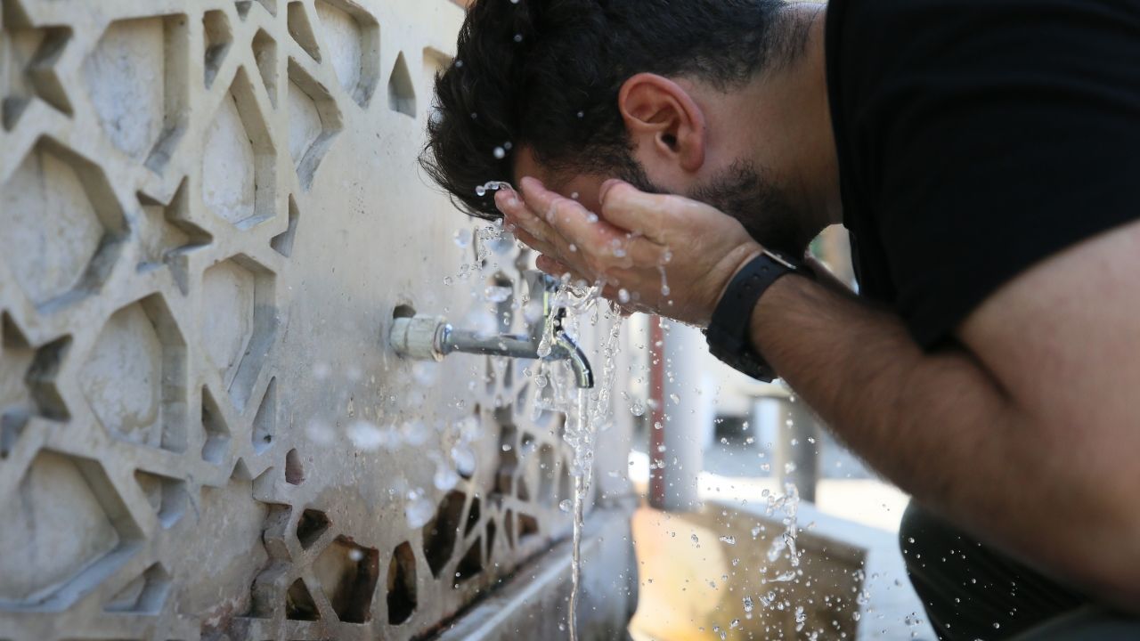 Sıcaktan korunmak isteyen bazı kent sakinleri, gölgelik alanlarda vakit geçirirken bazıları çeşmelerden yüzünü ve başını ıslatarak serinlemeye çalıştı.