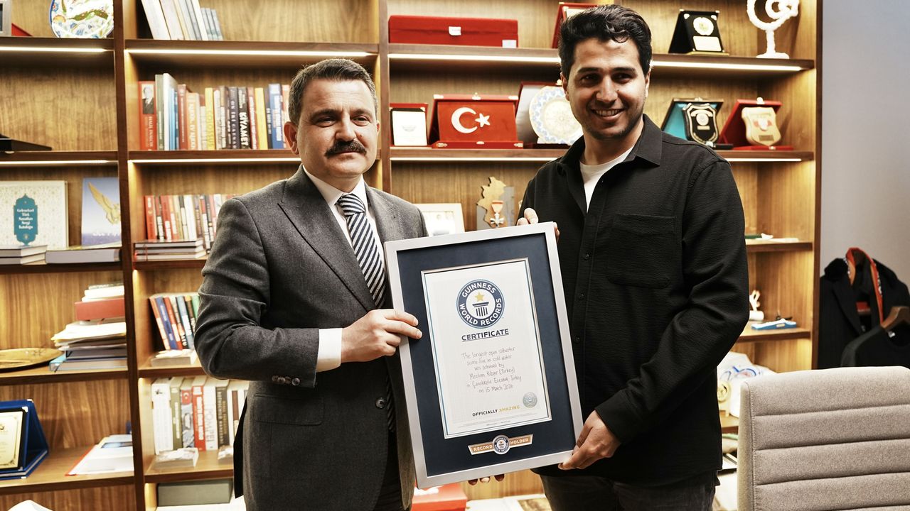 ÇANAKKALE (AA) - Gelibolu Yarımadası'nda 'Soğuk suda en uzun süre tüplü dalış' kategorisinde 36 saat 9 dakika 36 saniye ile Guinness Dünya Rekoru kıran profesyonel dalgıç Mazlum Kibar, Çanakkale Savaşları Tarihi Alan Başkanı İsmail Kaşdemir'i ziyaret etti.