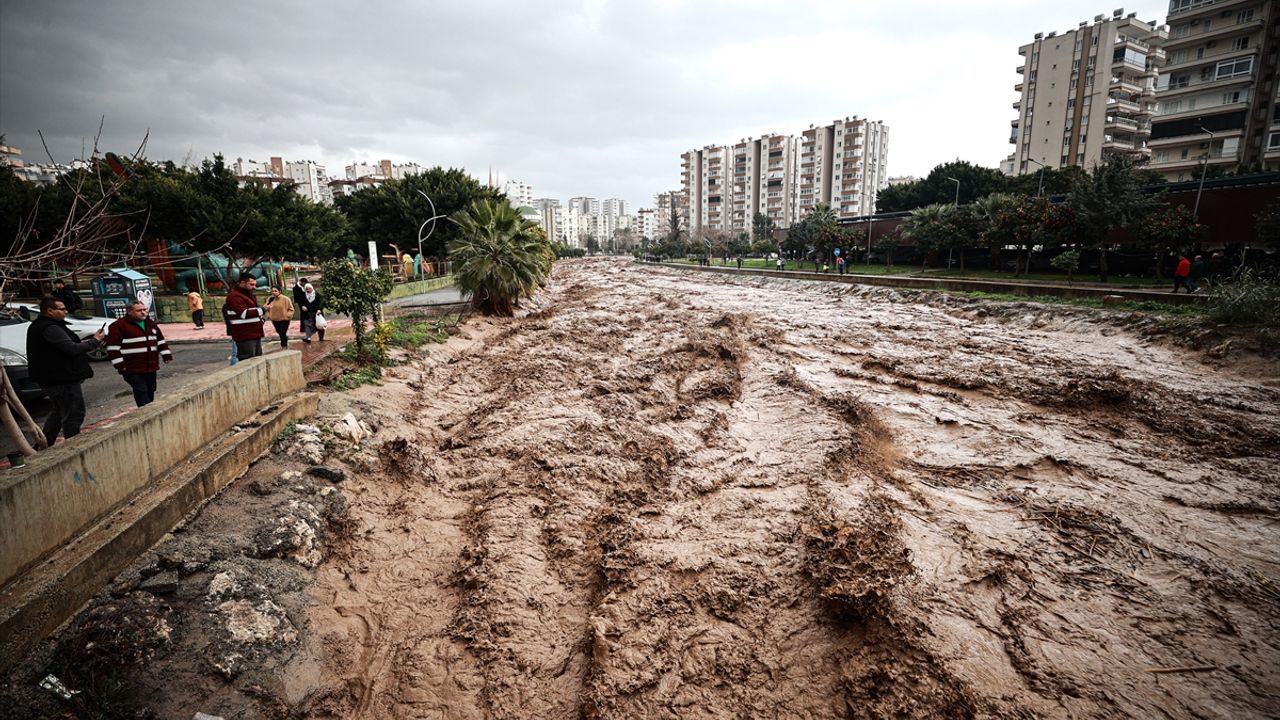 Devlet Su İşleri (DSİ) ve Mezitli Belediyesi ekipleri, derenin taştığı bulvarın çevresinde tahliye ve temizlik çalışması başlattı.