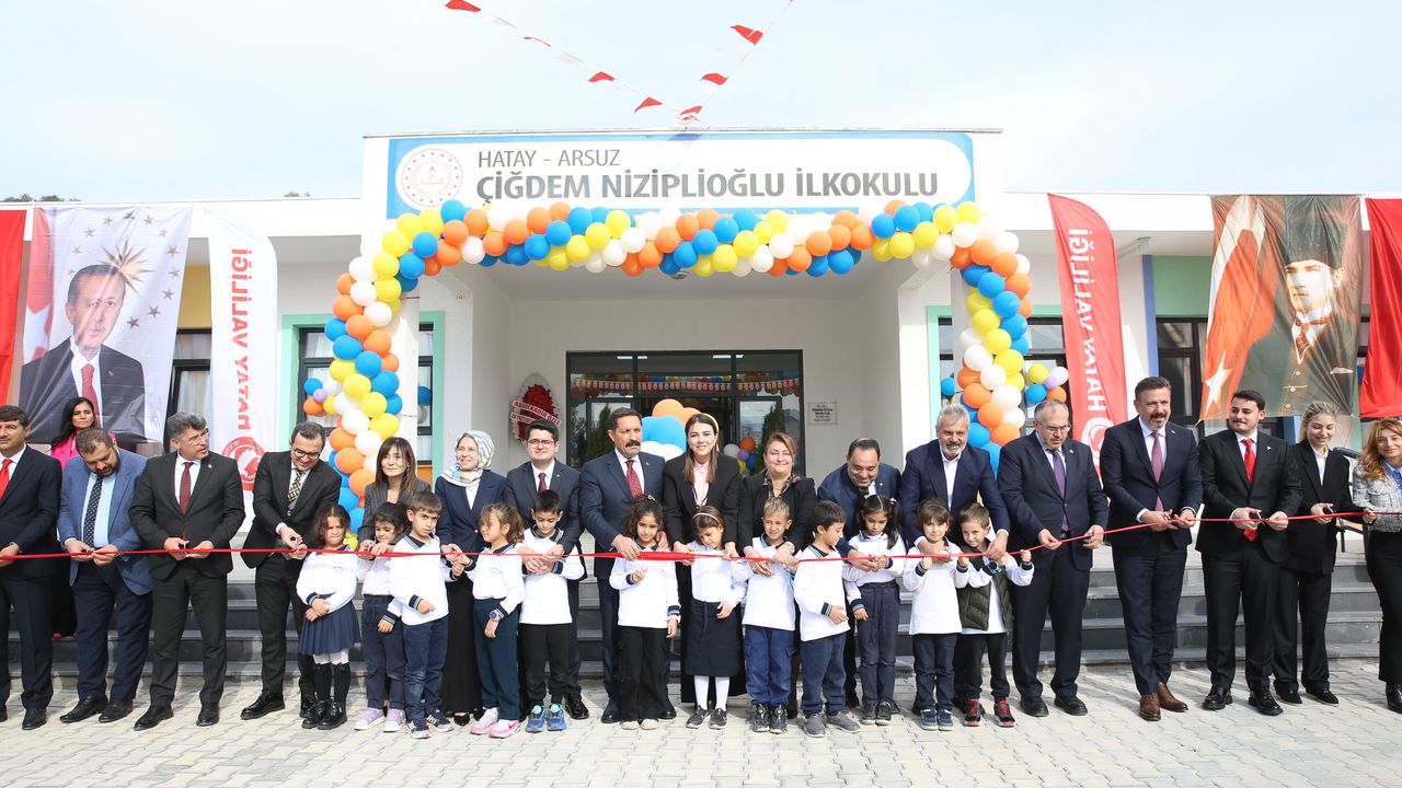 HATAY (AA) - Hatay'ın Arsuz ilçesinde 6 Şubat 2023'teki depremlerde hasar alması nedeniyle yıkılan ilkokulun, hayırseverlerin desteğiyle inşa edilen yeni binası törenle açıldı.