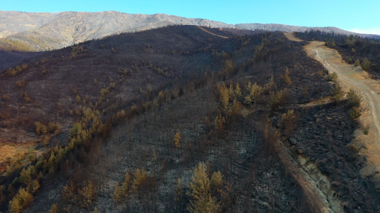 Yangının etkili olduğu 3 mahallede zarar gören alanlar dronla görüntülendi. Görüntülerde, yanan alanların yerleşim yerlerine yakınlığı ve alandaki birçok ağacın küle dönmesi yer alıyor.