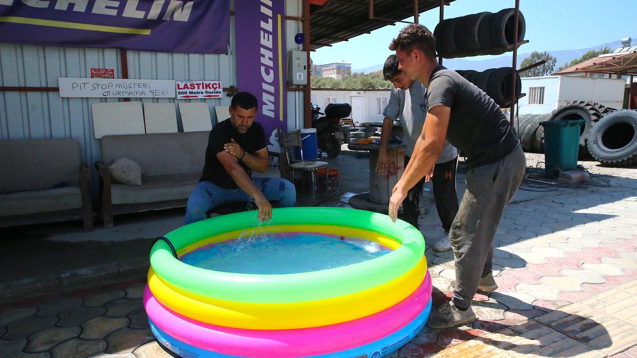 Sıcaktan bunalanlar gölgelik alanlarda serinlemeye çalışırken, lastik tamircisi Ahmet Yener de çözümü şişme havuzda buldu.