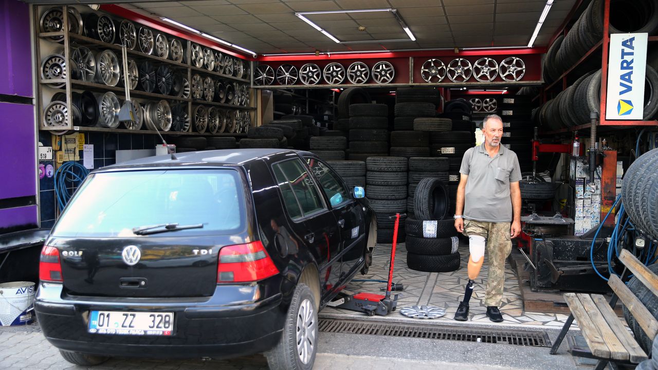 ADANA (AA) - YAKUP SAĞLAM - Bingöl'de uzman çavuşluk yaparken terör örgütü PKK'nın yola döşediği el yapımı mayının patlaması sonucu gazi olan ve protez bacakla ayağa kalkan 56 yaşındaki Yüksel Ünal, Adana'da 21 yıldır oto lastik dükkanı işletiyor.