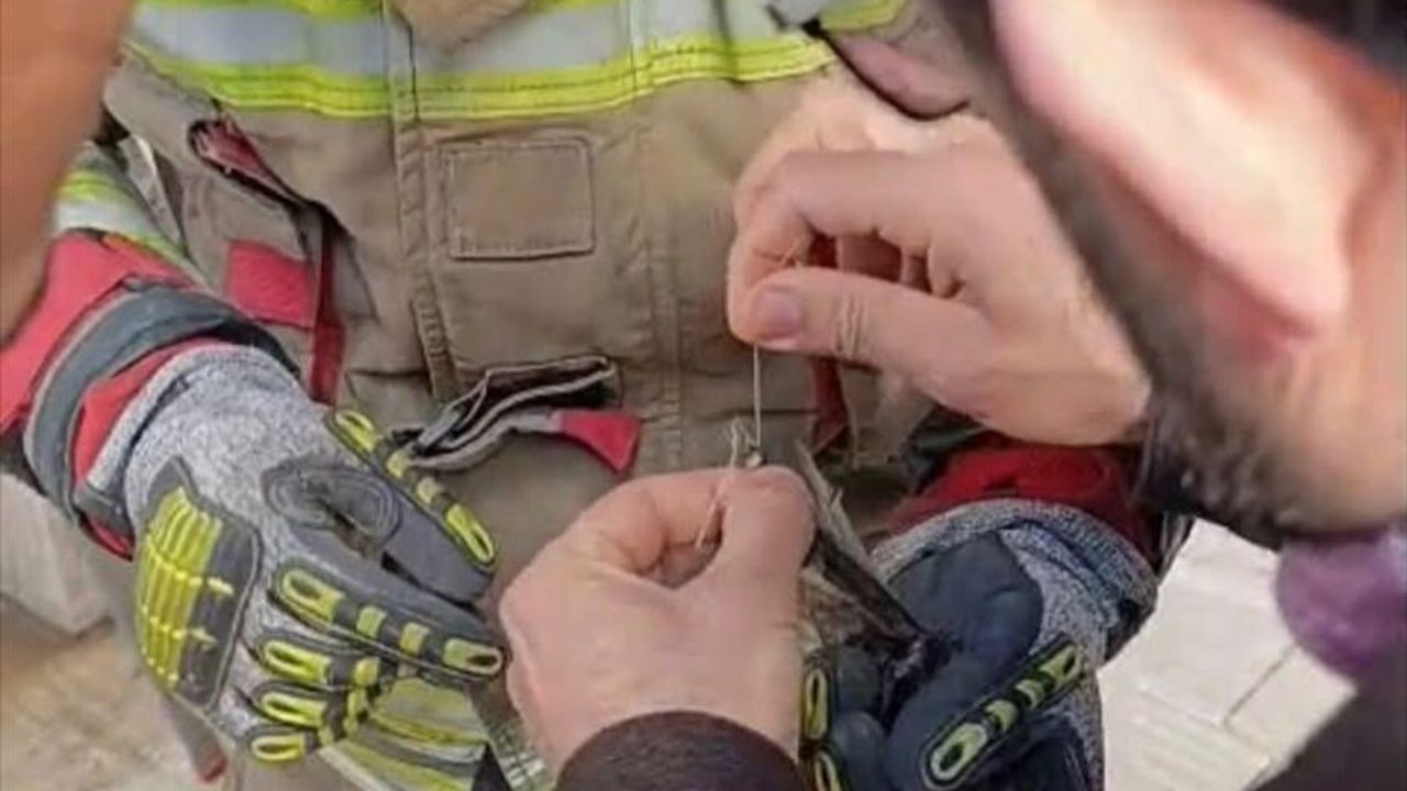 Savaş Mahallesi'nde bir apartmanın dış duvarında bir kuşun ipe dolanarak mahsur kaldığını fark eden vatandaşlar, durumu itfaiye ekiplerine bilgi verdi.