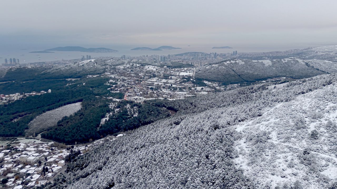 Pendik'teki Aydos Ormanı'nda kar manzarası, sabah dronla havadan görüntülendi.