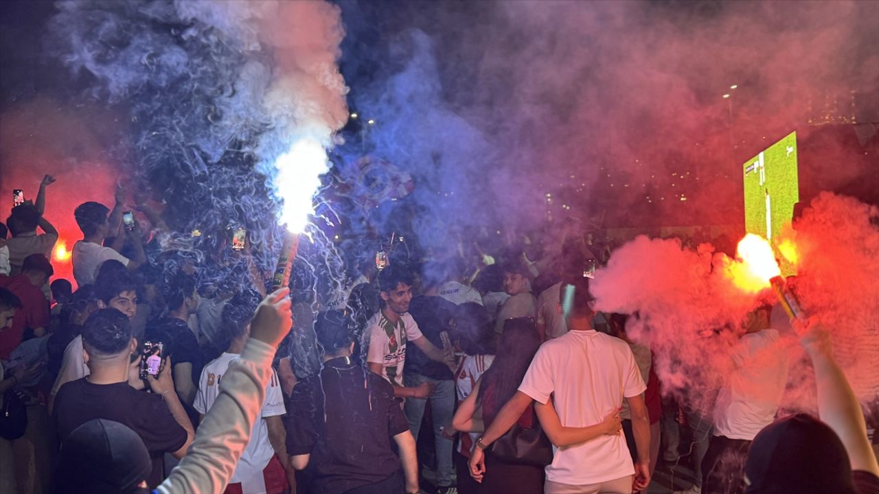 Araçlarıyla konvoy oluşturan taraftarlar, meşaleler yakarak şampiyonluk şarkıları söyledi.