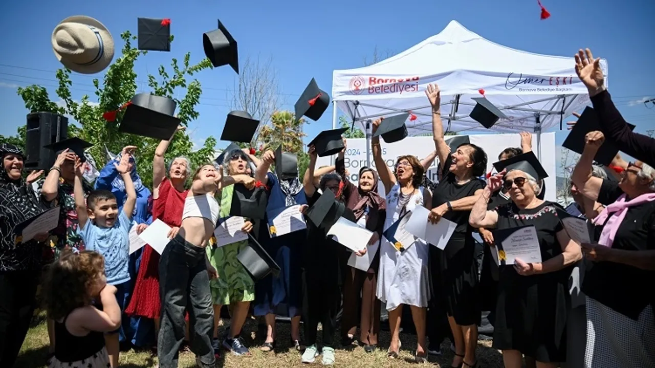 Bornova Belediyesi’nin Özgül Gündüz Sağlık Köyü’nde projelendirdiği Sağlıklı Yaş Alma Merkezi, ilk mezunlarını verdi. Bahçede düzenlenen törende mezuniyet belgelerini Bornova Belediye Başkanı Ömer Eşki’nin elinden alan 60 yaş üstü Bornovalılar, keplerini büyük bir coşku ve gururla havaya fırlattı.