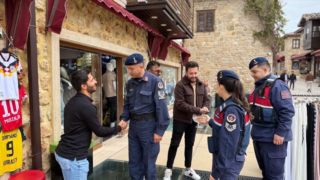ANTALYA (AA) - Antalya'nın Manavgat ilçesinde bulunan Side Antik Kenti'nde jandarma ekipleri esnaf ve misafirlerin bayramını kutladı.
