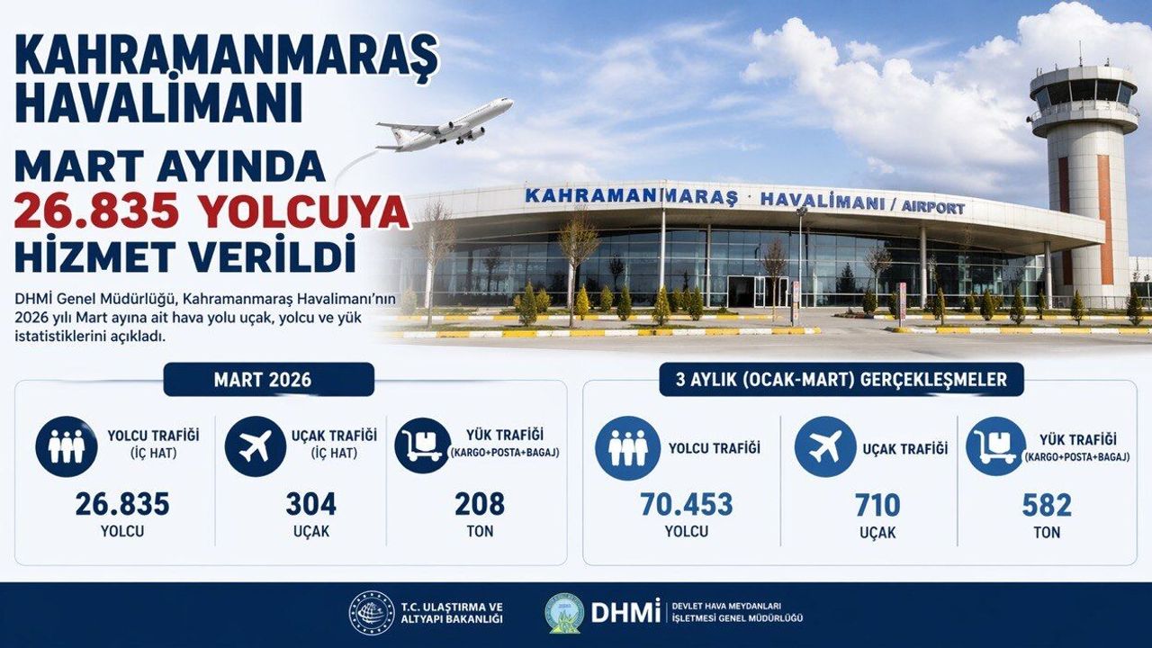 Öte yandan, 2026 yılı Ocak-Mart dönemini kapsayan üç aylık süreçte Kahramanmaraş Havalimanı’nda toplam 70 bin 453 yolcuya hizmet verildi. Aynı dönemde uçak trafiği 710, yük trafiği (kargo, posta ve bagaj) ise 582 ton oldu.