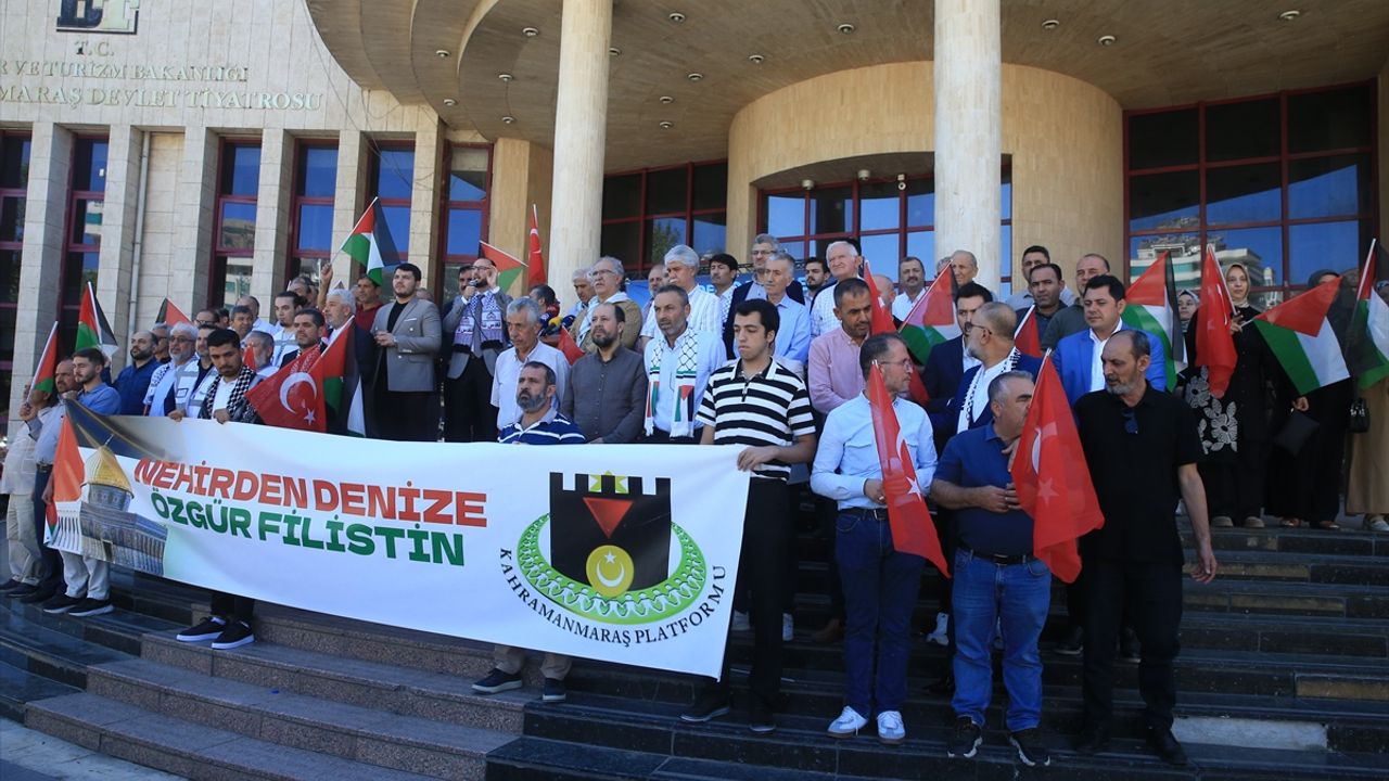 Kahramanmaraş Sivil Toplum Kuruluşları Platformu öncülüğünde Necip Fazıl Kısakürek Kültür Merkezi önünde bir araya gelen vatandaşlar, ellerinde Türk ve Filistin bayraklarıyla İsrail aleyhine slogan attı.