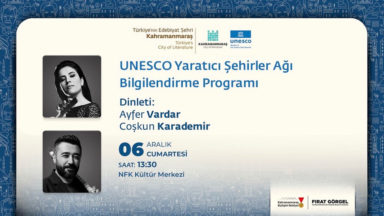 Türkiye’nin ilk UNESCO Edebiyat Şehrinde kültür sanat faaliyetlerini artırarak sürdüren Büyükşehir Belediyesi, Mevlâna İdris Kültür Sanat Sezonu kapsamında 6 Aralık Cumartesi günü saat 12.00’da Necip Fazıl Kısakürek Kültür Merkezi’nde UNESCO Yaratıcı Şehirler Bilgilendirme Toplantısı gerçekleştirilecek. UNESCO Yaratıcı Şehirler Ağı’na ‘Edebiyat’ alanında Türkiye’den dahil olan ilk şehir Kahramanmaraş’ın güçlü şairlik geleneği, edebi kimliği, ulusal ve uluslararası düzeyde görünür kılınması gibi konular toplantıda ele alınacak. Ayrıca programda sevilen müzisyenler Ayfer Vardar ve Coşkun Karademir’de müzik ziyafeti sunacak. Büyükşehir Belediyesinden yapılan açıklamada, bilgilendirme toplantısı ve müzik ziyafetine tüm vatandaşlar davet edildi.
