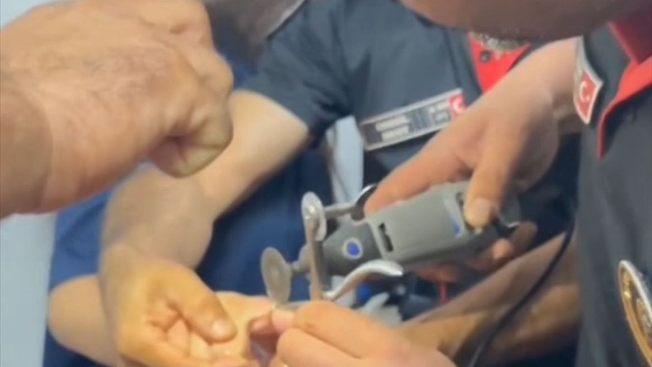 Hastaneye gelen ekip, yüzüğü, motorlu mini alet yardımıyla keserek çıkarttı.
