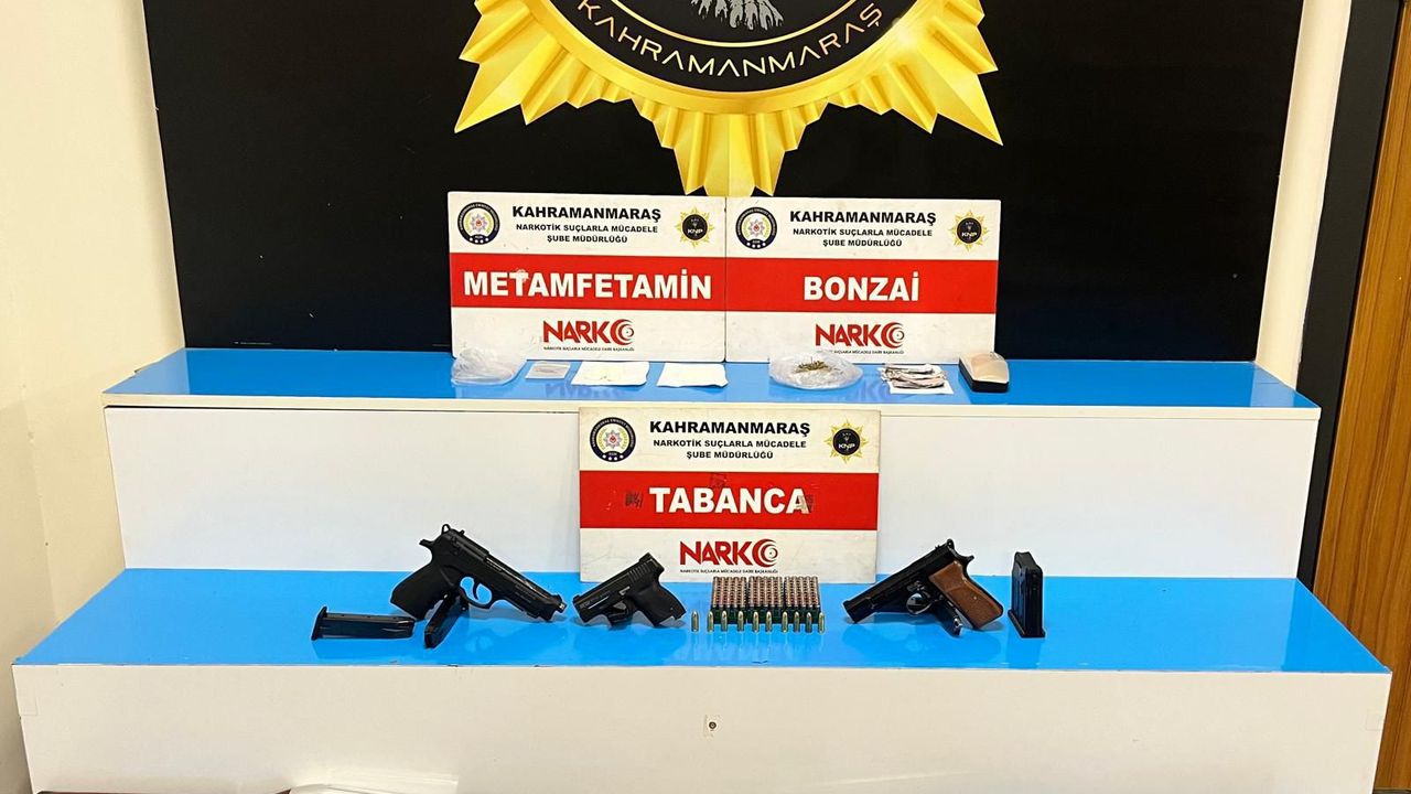 Belirlenen adreste yapılan aramada, bir miktar uyuşturucu, 3 ruhsatsız av tüfeği, 2 ruhsatsız tabanca, kurusıkı tabanca, 7 şarjör ve 160 fişek ele geçirildi.