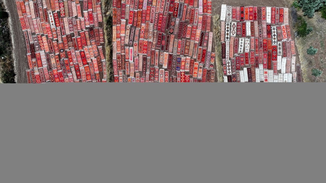 Türkiye'nin farklı illerinden toplanan kök boyalarıyla boyanmış, Yörük motifleri başta olmak üzere çeşit çeşit motifle bezenerek dokunmuş eski halı ve kilimler, tarlalara seriliyor.