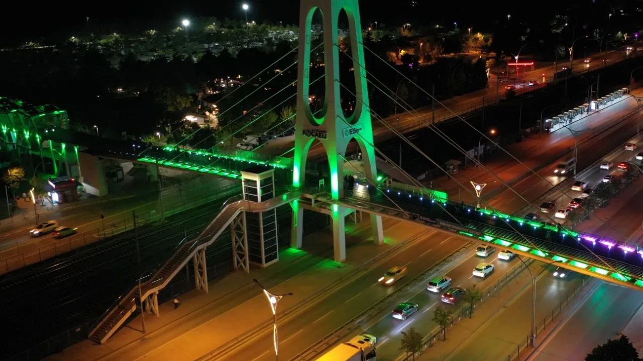 Kocaeli Büyükşehir Belediyesi ekipleri, şampiyon Kocaelispor için kentte bulunan tüm üst geçitlerin ışıklandırmalarını yeşil renk yaptı.KOCAELİ (İGFA) - Dev Kocaelispor bayrağını Osmangazi Köprüsü’ne ve İstanbul Boğazı’na asarak Süper Lig coşkusunu taçlandıran Büyükşehir Belediyesi, şehrin sembol yapılarından olan üst geçitleri de yeşil renkle aydınlattı.
