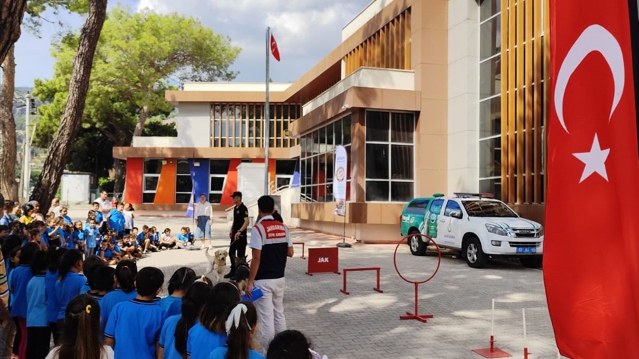 Jandarma köpek unsurlarıyla birlikte düzenlenen programda, öğrencilerin emniyetli şekilde köpekleri sevmesi sağlanarak hayvan sevgisi aşılandı.