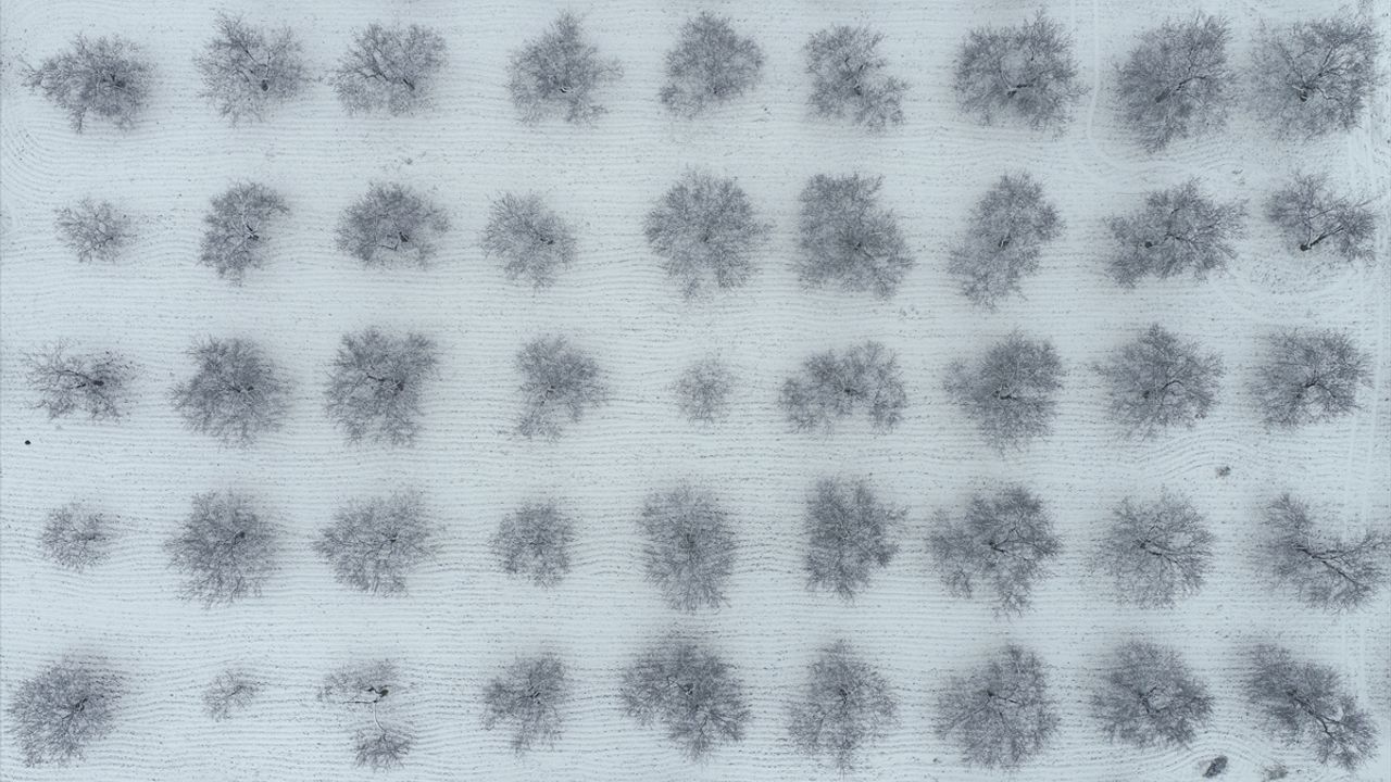Beyaz örtüyle kaplanan kayısı ağaçları, dron ile görüntülendi.
