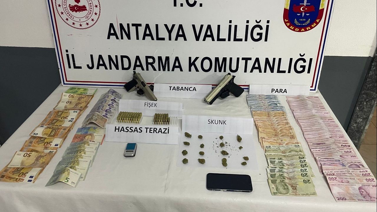 Şüpheli R.U.'nun ev ve iş yerinde gerçekleştirilen aramada, 50 gram skunk, bir hassas terazi, 2 adet ruhsatsız tabanca, 82 fişek ve suçtan elde edildiği değerlendirilen bir miktar para ele geçirildi.