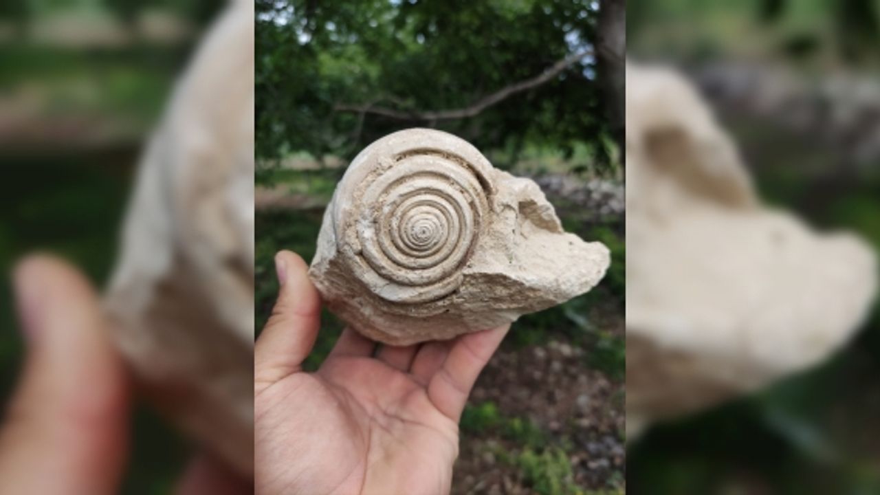 Mersin Bisiklet Derneği Başkanı Süleyman Uygun, kardeşi ve yeğeniyle, Toroslar ilçesinin Arslanköy Yaylası'nda bisiklet sürerken bir kayanın içinde salyangozu andıran fosil buldu.