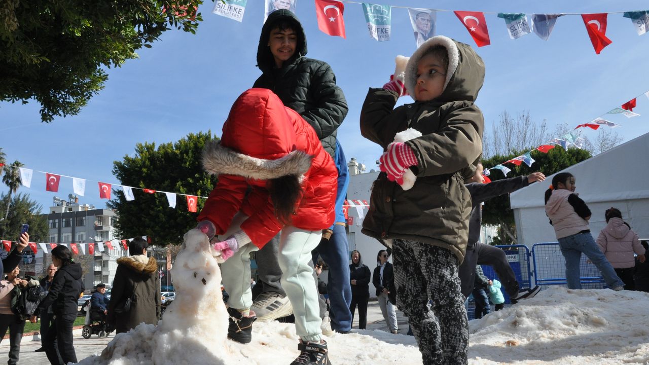 MERSİN (AA) - Mersin'in Silifke ilçesinde Toros Dağları'ndan toplanan karın döküldüğü meydanda çocuklar için etkinlik düzenlendi.
