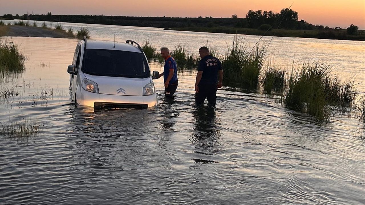 Sudaki hafif ticari aracı halat yardımıyla güvenli bölgeye çeken ekipler, 4 kişiyi karaya çıkardı.